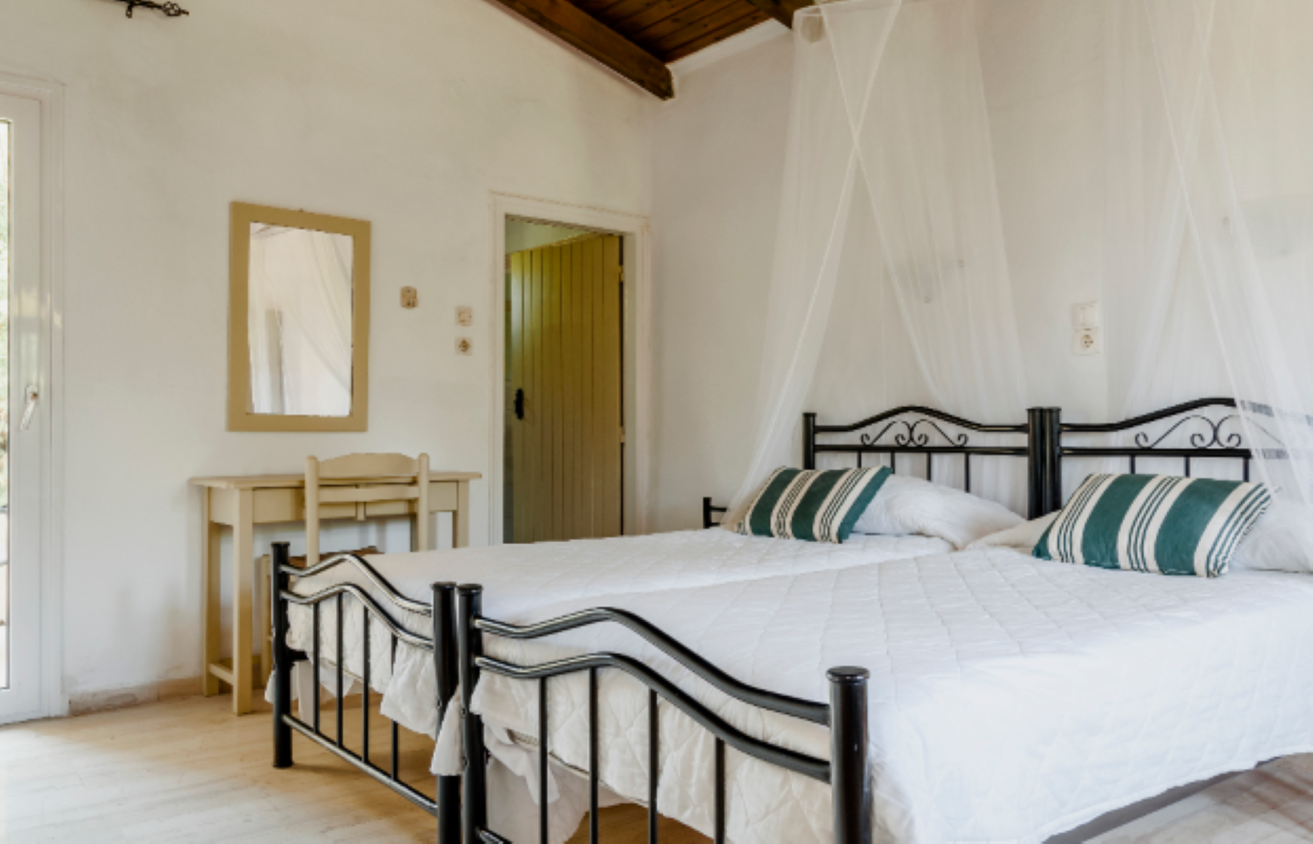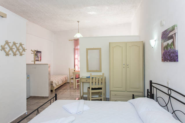 A Stavros large apartment comprises of two separate rooms, with 1 double bed, two singles and a sofa-bed. A combination of wooden shutter-doors, curtains, blinds, light marble floor and french windows allows a welcome breeze and shade in the hottest of weather. It sleeps 4-5 people.