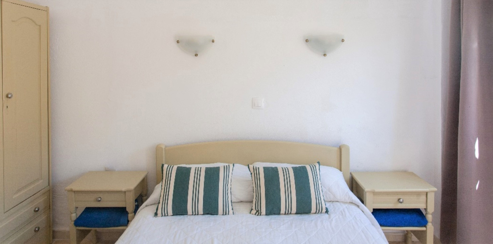 The Stavros medium apartment has two adjoining rooms one with 1 double bed and the other 2 single sofa-beds, 1or 2 shower-rooms with toilet, 1 small dining table, a kitchenette with limited cooking facilities and fridge, back and front balcony.