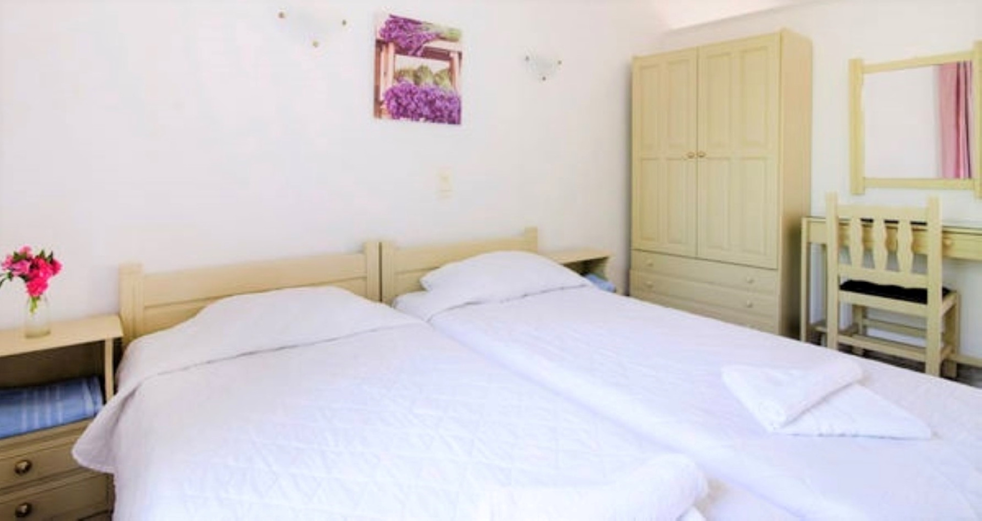 The Stavros medium apartment has two adjoining rooms one with 1 double bed and the other 2 single sofa-beds, 1or 2 shower-rooms with toilet, 1 small dining table, a kitchenette with limited cooking facilities and fridge, back and front balcony.